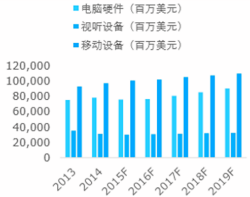 根据研究需要,将电子产品划分为三大类:个人电脑(台式电脑、笔记本电脑、平板电脑),视听设备(电视、游戏主机、数码相机、音响mp3等),和移动设备(智能手机)。受到国内经济总体环境低迷和过往几年电子产品高速发展带来的市场饱和影响,2015年中国电子产品消费需求增长速度呈现下滑态势。然而,中长期来看,政府在社会和经济方面的改革以及可支配收入的提升仍然给这一行业带来机遇。