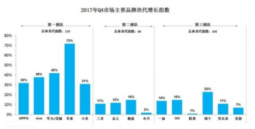 从2017年第4季度各手机品牌迭代增长情况来看:
