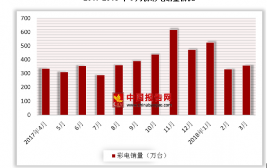 数据显示,2018年3月全国彩电市场销量达359万台,同比增长8.4%,环比上升8.3%。从销售额方面来看,2018年3月全国彩电市场销售额为120亿元,同比增长5.9%,环比上升14.8%。