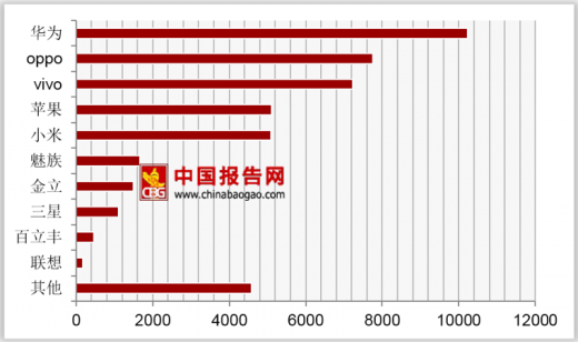 2017年国内手机市场,国产手机依然占据主导,华为手机在中国市场累积销量为1.0255亿部,整体销售份额约为22.8%,继2016年后持续排名榜首。排在第二位的oppo销量为7756万部,第三位vivo为7223万部,第四位苹果为5105万部,第五位小米为5094万部。相比去年,这四家增幅均不大,约在5%至8%之间。