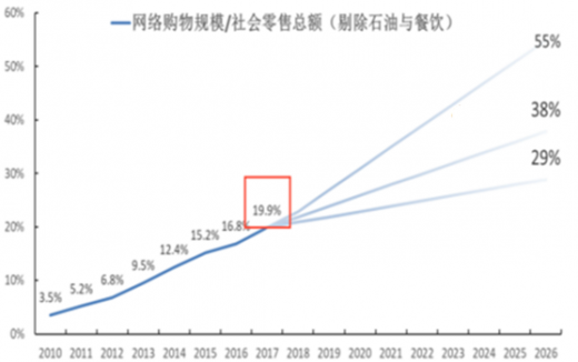 剔除石油与餐饮,网购规模占社会零售总额的比例从2010年的3.5%提升到2017年的19.9%。未来网购渗透率若要提升到40%-50%区间,唯一的途径是突破品类瓶颈。