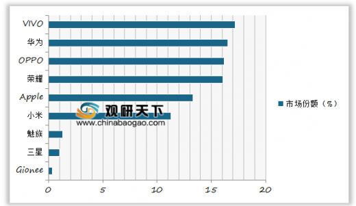 2018年11月国内智能手机销量排名中,vivo以626万台的销量,位列第一,市场份额高达17.2%,同比增长6%,环比负增长3%,华为以600万台的销量,紧跟其后,市场份额为16.5%,同比大涨35%,环比下降1%。