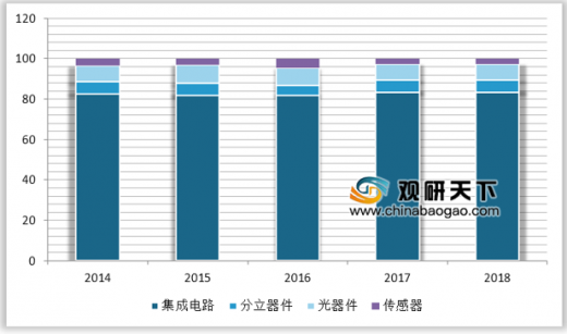 作为半导体产业主导类型,自诞生以来,带动了全球半导体产业自20世纪60年代至90年代的迅猛增长。在2017年全球4122.21亿美元的半导体销售额中,集成电路共计3431.86亿美元,占比达83.25%。