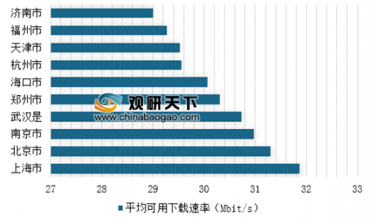 从固定宽带各省下载速率方面来看,上海、北京、江苏率先超过了30mbps,位列全国前三甲,全国有12个省份平均可用下载速率均超过了全国平均水平。从全国各主要城市情况来看,排名前五的城市分别是上海、北京、南京、武汉、郑州,平均可用下载速率均超过30mbps。