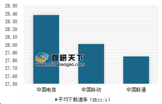 各基础电信企业中,中国居首位,最高平均可用下载速率达28.38mbit/s,三家基础电信企业的国定宽带忙闲是加权平均可用下载速率差别不大。