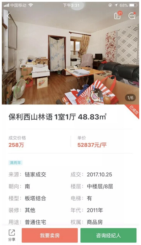 到了10月25日,保利西山林语一套48.83平方米的一室一厅,成交单价为5.3万元,仅仅半年的时间,均价下降了2.7万元,降幅约为34%。
