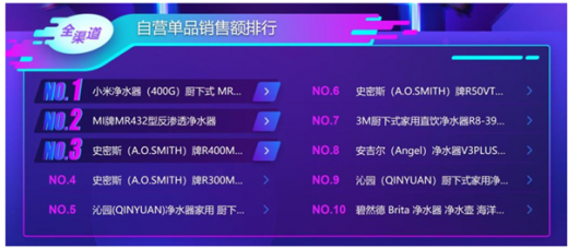 净水器方面,苏宁双十一快报显示,小米净水器成为最热销单品。截至上午10点00分,小米净水器依然占据单品销售额排行第一,延续了自己的优秀表现。不过在品牌销售额排行上,美的力压小米占据第一。