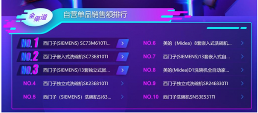 洗碗机品类,西门子拿下不仅拿下品牌销售额排行第一,还拿下单品销售额排行第一,并在单品销售额榜单强势刷屏(8款产品入围top10),这也难怪在苏宁厨卫快报中,西门子入选了销售top品牌,并贡献了洗碗机品类最受欢迎单品。