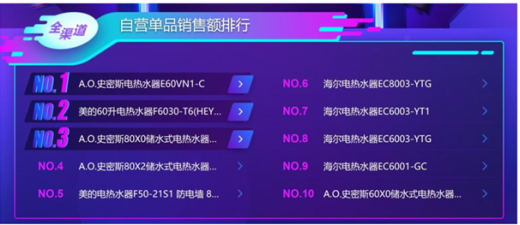 电热水器的悟空榜:品牌销售额排行方面,美的力压a.o.史密斯成为第一,海尔屈居第三,不过在单品销售额方面,苏宁厨卫开抢1小时时间中拿下电热水器最受欢迎单品的a.o.史密斯,依然维持了强势表现,不仅排名力压美的,入选单品数量也超过美的,再加上海尔对美的虎视眈眈(单品数量方面,美的2,a.o.史密斯和海尔均为4款)。