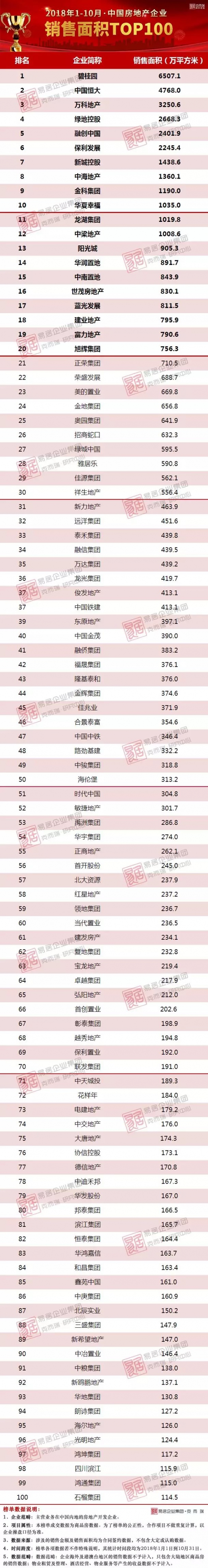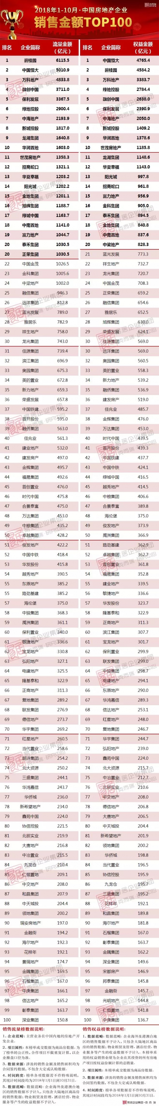 根据数据显示,2018年1-10月中国top100房企整体销售规模为7.8万亿元,同比增长38.5%;10月top100房企销售规模为7846亿元,比上月下降921亿元,降幅为10.5%。从销售金额入榜门槛来看,百强房企各梯队入榜门槛较去年同期继续提升,top20、top30和top50房企销售金额入榜门槛增幅均在50%左右,分别为47.2%、48.6%和46.6%。