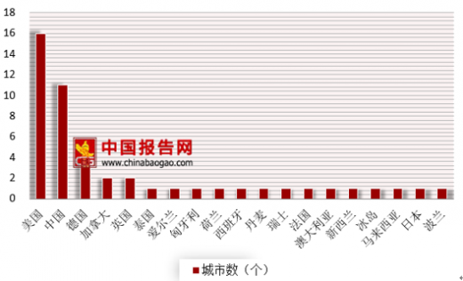 根据资料显示,前50名城市共来自19个国家,其中美国最多,有16个城市进入前50,其次是中国11个,德国4个,加拿大、英国和泰国各2个,爱尔兰、匈牙利、荷兰、西班牙、丹麦、瑞士、法国、澳大利亚、新西兰、冰岛、马来西亚、日本和波兰各1个。