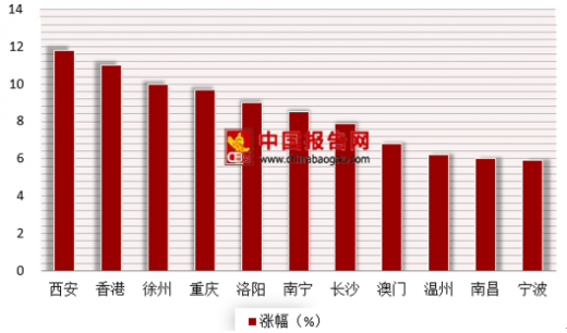 我国受全国各地限购政策影响,中国大陆城市的房价涨幅明显放缓。2018年上半年我国现共有西安、香港、徐州、重庆、洛阳、南宁、长沙、澳门、温州、南昌、宁波11个城市进入全球前50名。其中香港、徐州、重庆和洛阳涨幅位列全球前20。对比去年同期,新增徐州、洛阳、温州和宁波四个大陆城市。