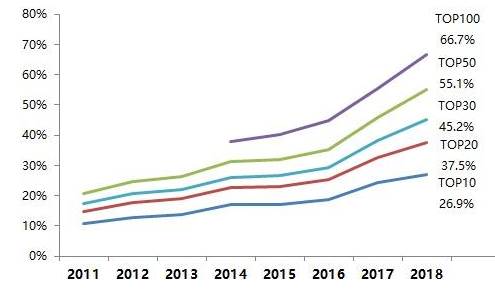 2018年,top200各梯队房企规模持续增长,销售金额集中度较去年同期均有较大幅度的提升。其中,top10房企集中度达26.9%,top20房企集中度达37.5%。而top50和top100房企的集中度提升幅度较大,分别较2017年提升9.3个和11.3个百分点至55.1%和66.7%。