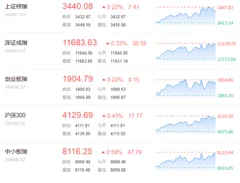 截至发稿,上证综指上涨7.41点,报3440.08点,涨幅0.22%;深证成指上涨38.58点,报11683.63点,涨幅0.33%;创业板指上涨4.15点,报1904.79点,涨幅0.22%。