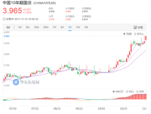 中国10年期国债现券(票面利率3.59%)成交收益率达3.945%,刷新2014年来新高,上周五加权收益率为3.9175%。