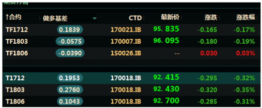 中金所10年期国债期货主力合约t1803一度跌0.39%,5年期国债期货主力合约tf1803一度跌0.21%。?????