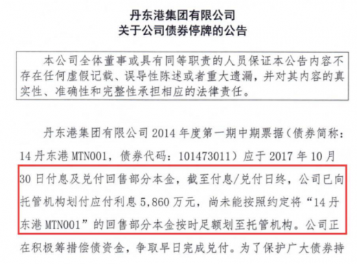丹东港集团近日发布公告称,其2014年度第一期中期票据(债券简称:14丹东港mtn001)应于今年10月30日付息及兑付回售部分本金,已向托管机构划付了5860万利息,尚未能按照约定将该笔债券的回售部分本金按时足额兑付。