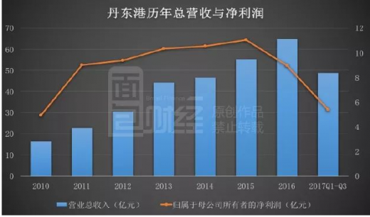 今年前三季度,丹东港总营收为48.63亿,同比下跌1.41%;净利润为5.39亿,同比大跌19.55%。2016年,其净利润就曾下降19.1%。下图为丹东港历年总营收与净利润: