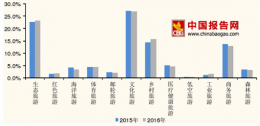 2016 年旅游景区项目投资继续增加,实际完成投资 7371 亿元,占全部旅游投资的 56.7%,新业态投资增速加快:旅游基础设施类投资 1122 亿元,占全部旅游投资的 8.6%,同比增长 19.8%。旅游购物项目投资 872.8 亿元,同比增长 24.4%。从业态分布看,资金流向主要集中在文化旅游、生态旅游、乡村旅游以及温泉滑雪、低空飞行和工业旅游等新型业态。文化旅游投资 6593 亿元,占全部比重为 26.9%,生态旅游产品投资 5717 亿元,占 23.3%,乡村旅游投资 3856 亿元,占 15.7%,同比增长 47.6%,低空旅游和工业旅游分别增长 84.2%和 69.8%,滑雪、特色餐饮等项目同比增长111%和 128.8%。