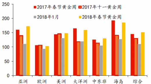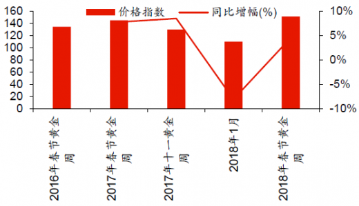 2018年春节黄金周期间,出境旅游价格综合指数达到近年来高值,反映出境游旺盛需求。据艾威联合数据,2018年春节出境游价格指数同比增加4.5%,且高于2017年十一黄金周。我们认为出境旅游价格指数上涨,主要反映出春节黄金周期间出境旅游旺盛需求。
