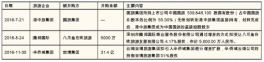 2015 年起景点类公司竞相开始操刀外延项目,2016 年旅游企业加速整合:2015 年起旅游行业迎来兼并重组热潮,通过投资并购最大最强。2016 年多起旅游集团的资源整合,国旅集团整体并入港中旅集团,合并打造最大旅游央企;华侨城战略重组云南世博集团。旅游企业之间的资源、业务整合型投资增加,国企改革加速推进。