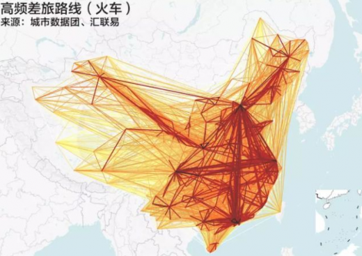 作为主要的差旅出行方式之一,火车热门路线的结构亦呈“十字架 小雷达”。其