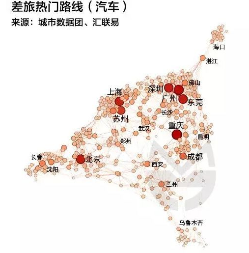 西南地区(成都、重庆、贵州、昆明等)也形成了联系紧密的汽车出行网络。