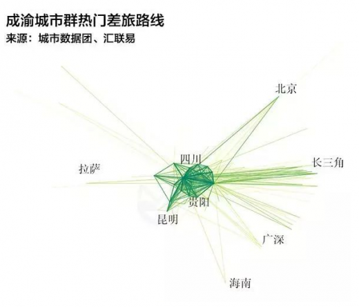 成渝地区的区域内出行特征较为明显,集中在西南地区(成都、重庆、贵阳、昆明)。而省外联系最强的则是通往长三角的路线。