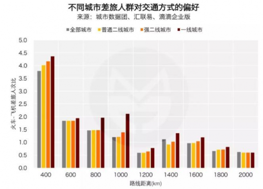在此提一句,在800-1400公里之间,一线城市的差旅人群更偏爱铁路。