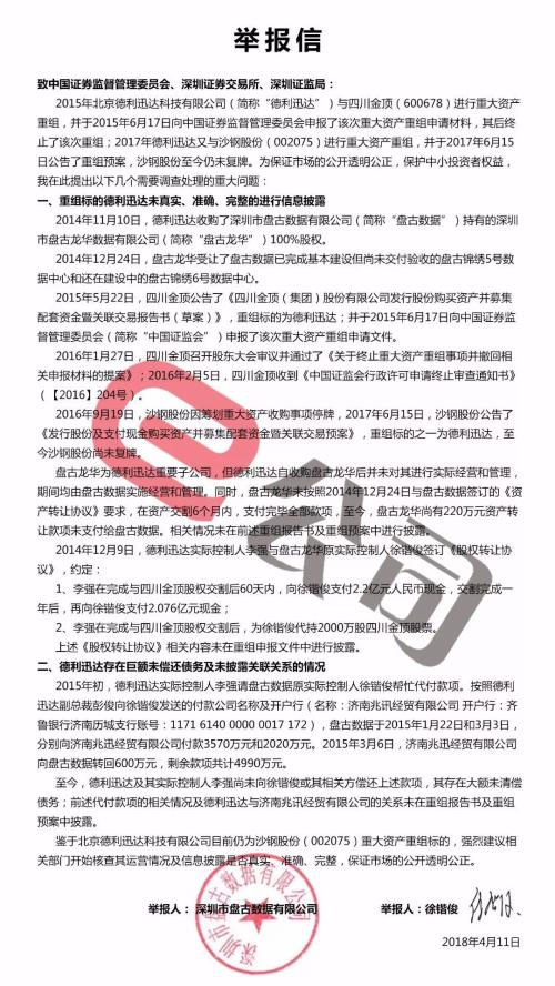 3、2015年5月,四川金顶披露重组草案。(注:四川金顶2014年11月27日公布的重组预案中,盘古数据尚不在德利迅达子公司列表之中,此次草案中加入。)2016年1月,四川金顶终止收购德利迅达。2017年6月,德利迅达成为沙钢股份重组标的之一,后者至今尚未复牌。