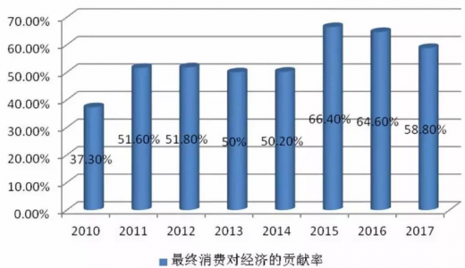 消费:经济发展让中国人富裕起来,可支配收入提高,经济结构调整让国人开始将储蓄存款更多投向消费市场。伴随着经济新常态与人口拐点的来临,年轻一带消费意愿更强烈。与此同时,新的经济业态、消费信贷模式也都促进了居民消费增长。2004年以来,消费对经济增长的贡献率总体呈上升趋势。特别是2010年以来,消费贡献率上升很快。2018年一季度,消费对经济的贡献率达77.8%。与之相对,按gdp口径计算的居民储蓄率则从2010年以前的16%下降到2017年的7.7%,由此可见一斑。