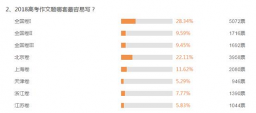 高考首日,作文题一直霸占热搜,新浪教育推出“2018高考作文题调查”,截止发稿时间,参与人数超过2.5万。根据调查,最难作文考题是全国ii,占比26.1%,差评多于好评,最容易的是全国卷i,占比28.47%。高考还未结束,作文难度pk仍在继续,最难省份的考生,你们还好吗?