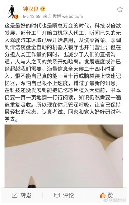 @钟汉良2012年押中福建作文题,2014年押中广东作文题,今年写给考生的话又契合全国一卷作文题,更博能给考生们当素材的爱豆,可以说真的很用心了。
