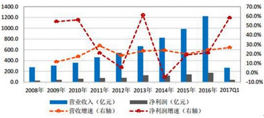 2017年环保行业将延续在政策和监管力度上的利好,从2017年一季度环保行业业绩表现来看,53家上市公司整体实现营收263.46亿元,同比增长26.62%;实现净利润38.32亿元,同比增长58.17%。环保行业季节性较强,业绩确认多集中在下半年。