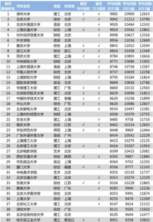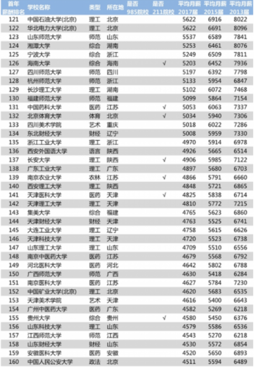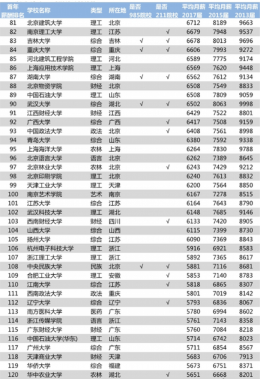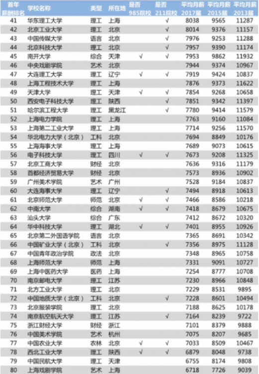根据报道消息,日前中国薪酬网公布了2018年中国大学毕业生薪酬排行榜top200。通过对包括39所985工程院校和112所211工程院校在内的近百所高校2017届、2015届、2013届本科毕业生进行调研,其数量达到281万人,从而计算出各毕业生的薪酬状况。
