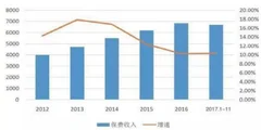 数据显示,2017年1-11月我国险市场保费收入增速10.34%。2012-2017年保费增速呈现不断下降并企业稳定的态势。