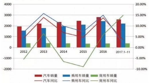 根据数据显示,2017年1-11月,我国销售2584.49万辆,增速为近5年来最低增速。其中乘用车销售2209.14万辆,;商用车销售375.35万辆。二手车市场方面,2017年1-11月交易量为1117万辆,同比增长19.96%。