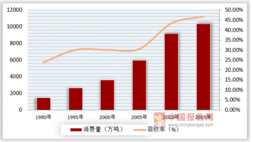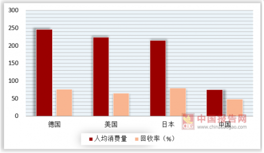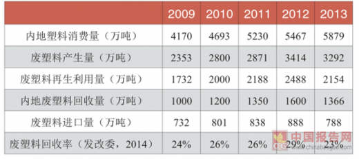 近年来,我国的废旧塑料回收处在较低水平,2013年我国塑料消费量达到5879万吨,回收率为23%,相较于欧盟等发达国家我国的塑料回收率处在前列。