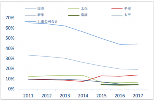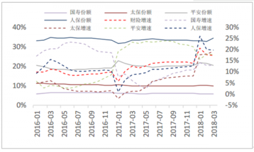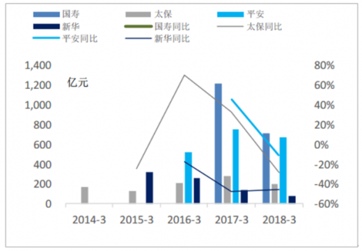 2016年我国保费收入突破3万亿,同比增速达27.7%,总资产突破15万亿。从2016年下半年开始,行业进入一个整顿、调整期:监管环境发生较大变化,监管当局频发一系列规范、指导性文件,旨在治理行业乱象,规范遏止激进型理财产品,提倡保险行业回归本源。在外部监管环境出现较大变化的情况下,2017年下半年开始,行业保费增速出现明显回落,全年实现原保险保费3.7万亿,同比增长18%,为近5年以来增速首度下降。
