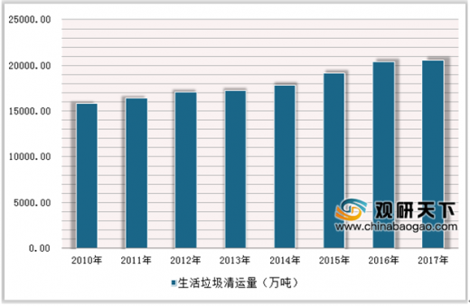近年来,国家相关部门及各城市纷纷加大治理力度,加强对生活垃圾的清运力度。2010-2016年全国生活垃圾的清运量小幅增加,增速波动变化。至2016年,全国生活垃圾清运量达到了20362.0万吨,较上年同期同比增长6%。据测算,2017年全国生活垃圾的清运量为20546.8万吨。