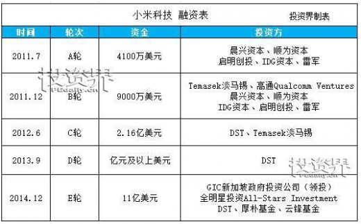 小米ipo引发了全球资本市场的关注,在国内,背后的vc/pe也是期盼已久。自2010年到2014年,小米一共完成了6轮融资,投资方众多,包括晨兴创投、启明创投、idg资本、淡马锡、dst、gic、厚朴投资和云锋基金等数十家vc/pe机构(投资界制表如下)。