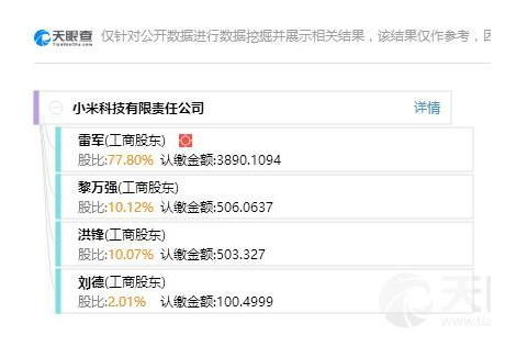 投资界(微信id:pedaily2012)在天眼查中获悉,雷军在小米集团旗下的小米科技公司持股77.8%,黎万强则占股10.12%。有人称,小米上市,雷军将成为新首富。