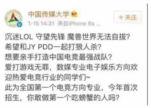 2016年12月21日,中国传媒大学南广学院在九游会登录j9入口官网上贴出了2017年的本科招生专业以及学费,而n19号专业则赫然是艺术与科技(电子竞技分析方向),招生计划为40人。