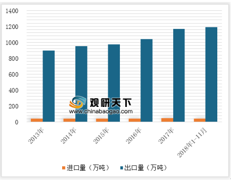 目前,中国塑料制品以出口为主,出口量持续增长,2016年出口量突破1000万吨,2018年1-11月中国出口塑料制品1190万吨,同比增长13%。