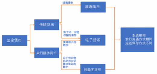 与传统纸币相同,央行数字货币可以以电子货币形式存在。当央行数字货币存入银行电子账户,形成普通数字存储于数字钱包,就形成了电子货币;当数字货币通过加密数字存储于数字钱包,并运行在特定数字货币网络中,就形成了纯数字货币。