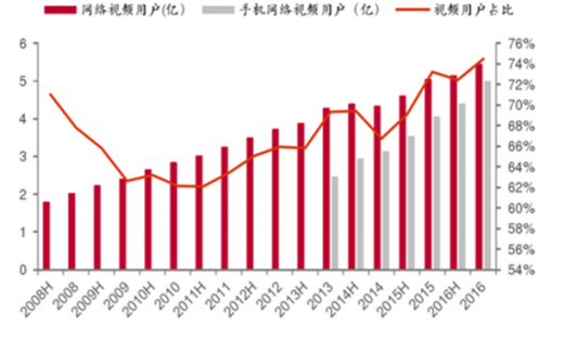 我国是目前网民数量规模最大的国家,得益于网络渗透率的快速提高,我国网络视频用户规模也居世界首位。2016年我国网民规模超过7.3亿,移动网民超过6.95亿,整体互联网普及率达到53.2%;网络视频用户数量超过5.4亿,其中移动网络视频用户数4.99亿,移动端渗透率超过90%。2010年以来我国网络视频用户数占网民比例不断上升,目前在75%左右,未来可能仍将小幅上升。