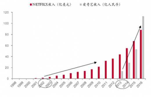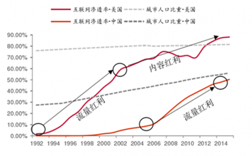 互联网普及率的长期是城市化率,普及率出现拐点后“内容红利”替代“流量红利”,付费开始崛起。以美国经验来看,互联网渗透率的长期天花板是城市化率,原因在于互联网的规模效应依赖于人口的集中和基础设施的完善。目前我国城市化率约为57.3%,互联网渗透率53.2%,预期未来将保持平稳增长。渗透率的提高带来流量红利,而渗透率接近天花板后拥有的巨量用户则带来内容红利。美国于2000年左右进入拐点,netfilx的在线流媒体业务2003年以后逐步发展,并在2010年左右迅速发展;我国2013年左右进入拐点,2014年以来网络视频市场存速发展,我们预计未来3-5年仍将是市场的快速发展期。