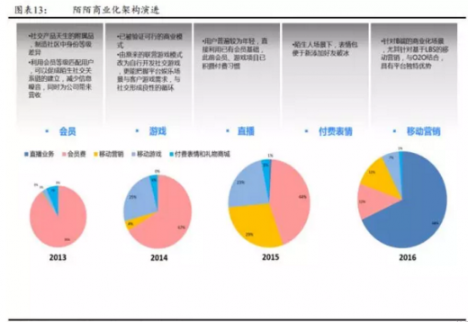 陌陌自上线以来,探索了包括会员、游戏、付费表情、移动营销与直播等变现方式,最后通过直播及视频化,收获营收的快速增长。其泛社交泛娱乐战略帮助用户形成内容沉淀,提升用户参与度,延长用户使用时长。