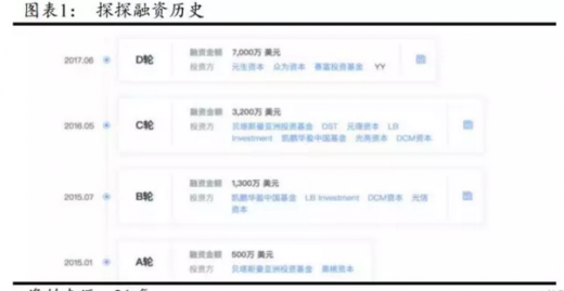 探探于2014年上线。2014年11月,探探完成由贝塔斯曼亚洲投资基金(bai)领投的500万美元a轮融资。2015年7月,探探完成dcm、kpcb、光信资本、lb资本等机构共同投资的1300万美元b轮融资。2016年3月,完成了3200万美元c轮融资,dst、元璟资本等领投。最近一轮融资为2017年6月,其完成7000万美元的d轮融资,yy(欢聚时代)、元生资本领投,赛富投资基金、众为资本等多家投资机构参与投资。