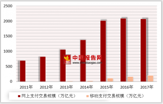 2017年网上支付交易规模达2075.1万亿元,较2016年小幅下降0.5%,2017年移动支付规模达202.9万亿元,较2016年增长28.8%。近年来网上支付交易规模趋于稳定,移动支付增长速度有所下滑但保持增长,随着中国第三方移动支付产品的完善以及消费者支付观念的转变,移动支付将会进一步普及,短期内移动支付交易规模将保持稳定增长。